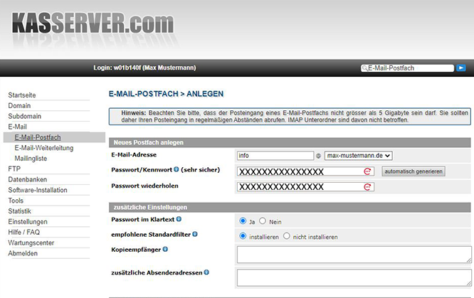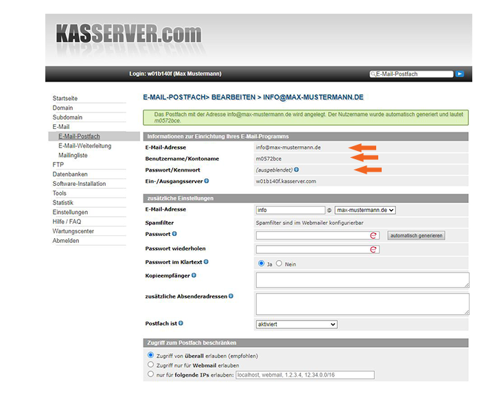 Das System generiert automatisch für Sie einen Benutzername für den E-Mail-Account und generiert den Posteingangs-u. Postausgangsserver.